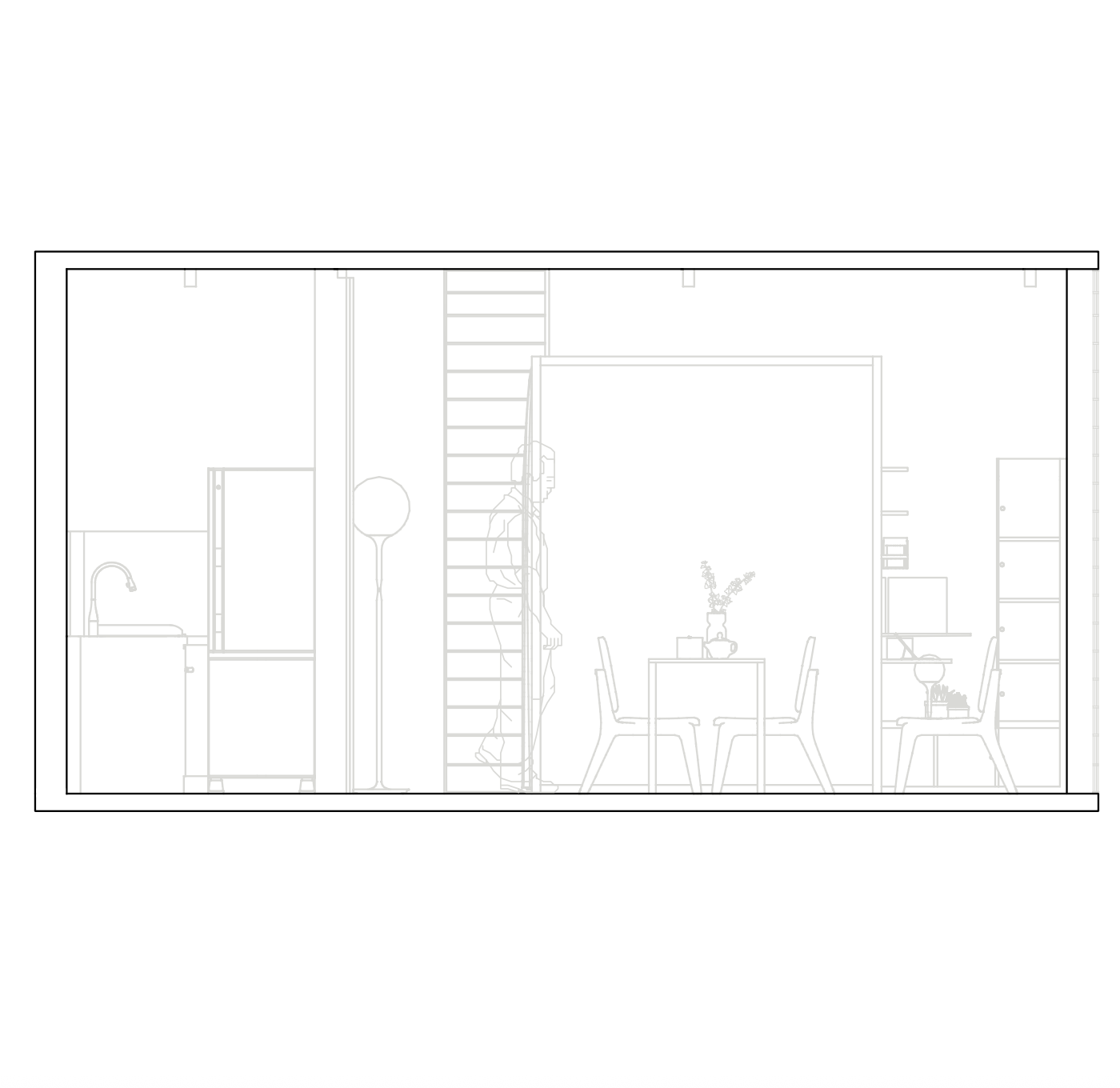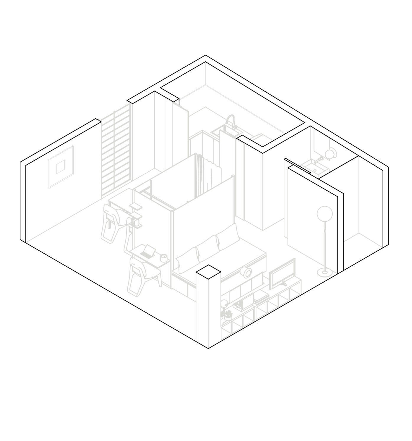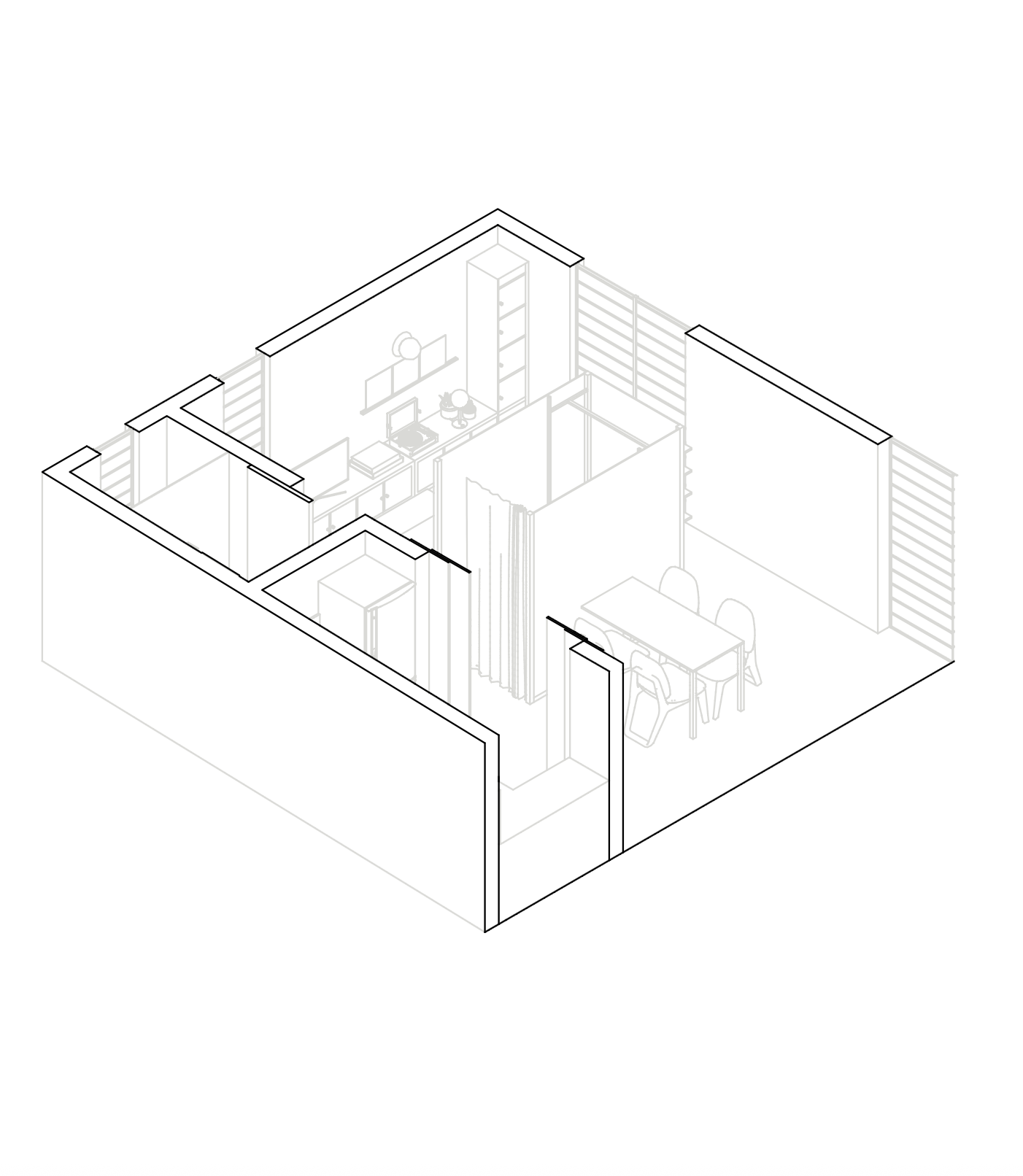 The challenge was to design a multifunctional piece of furniture for one of the building's studio apartments, addressing the shifting needs of its occupants. We envisioned a piece that could adapt: for working, resting, storing, and socializing. A structure that didn’t impose a single use, but instead supported different rhythms of life within a compact space.